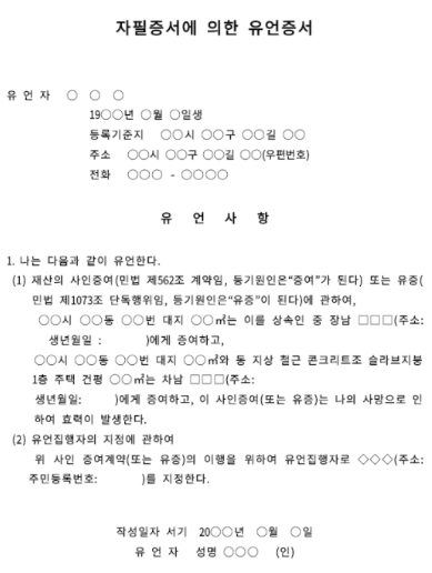 - 타이핑이 아닌 직접 손글씨로 작성해야 자필 유언장 인정 가능