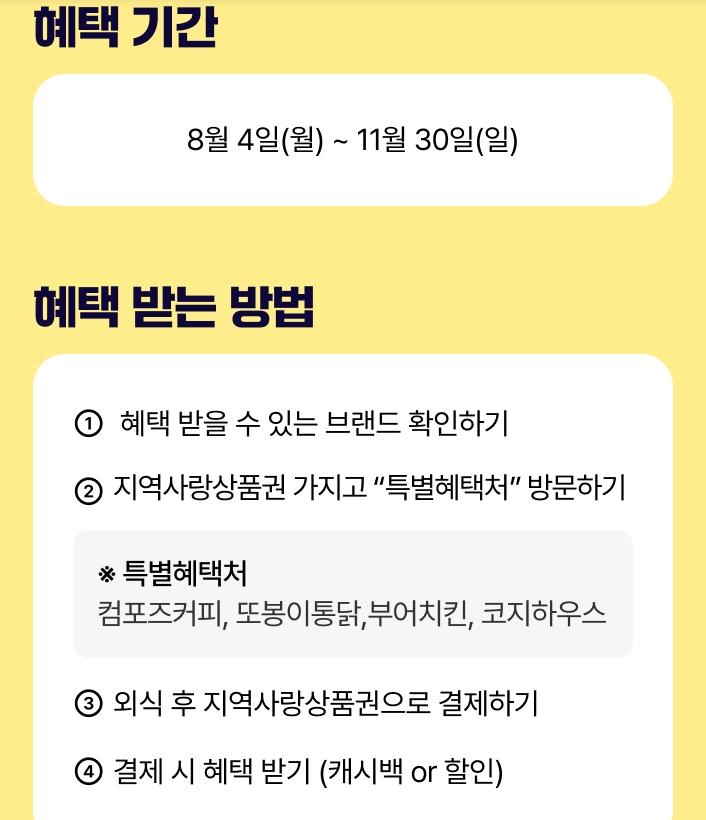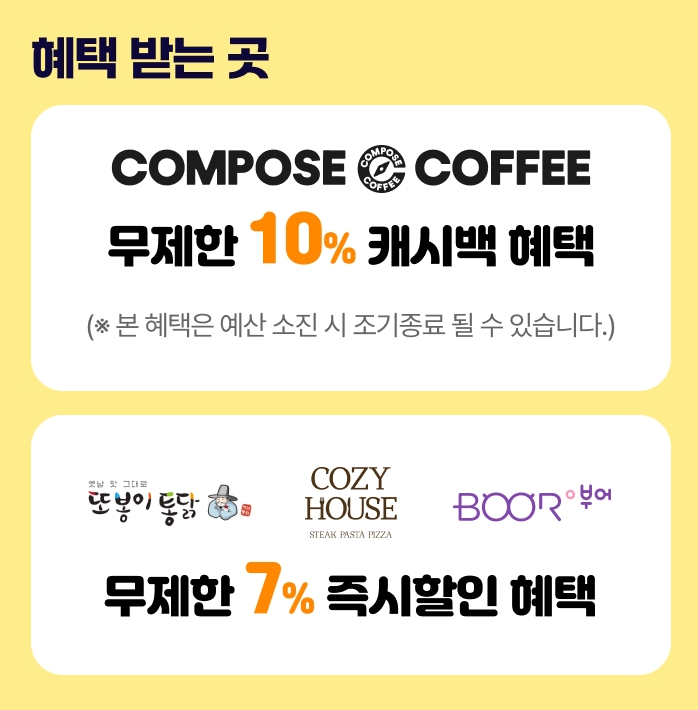 • 참여 브랜드 : 컴포즈커피, 뚜봉이통닭, 부어치킨, 코지하우스