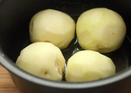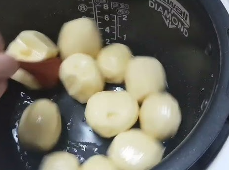 • 전기밥솥 안에 감자를 넣고 물은 바닥에 종이컵 1컵 정도만 살짝 넣습니다. (※ 감자가 물에 잠기면 안 돼요!)
