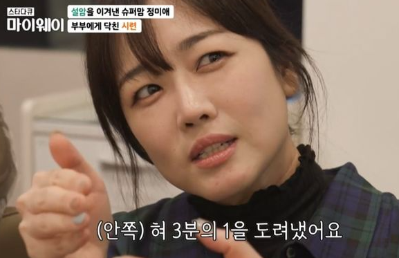 정미애는 몇 달간 낫지 않던 구강 염증으로 병원을 찾았다가 설암 3기 판정을 받았고, 대수술로 혀의 일부를 절제했습니다.