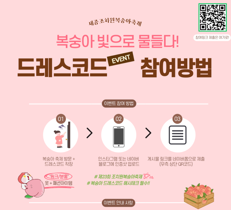 드레스코드 이벤트(핑크): 분홍색 옷·모자·소품을 착용하면 참여 가능. 하루 선착순 900명. 스탬프 투어, 미니 올림픽, 베스트 복숭아룩 콘테스트, 인생네컷 촬영권 등 경품 제공