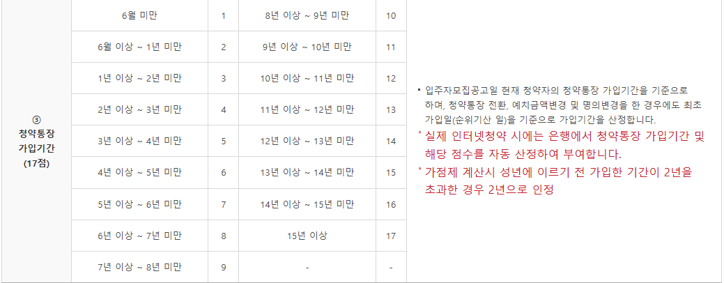 청약통장 가입기간 | 1년당 1점 | 17점 |