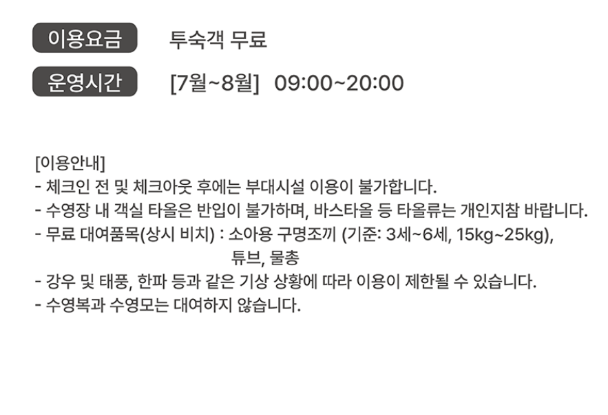 - **성수기(7~8월)**은 09:00~20:00, 단 18~20시 'No Kids Zone' 운영