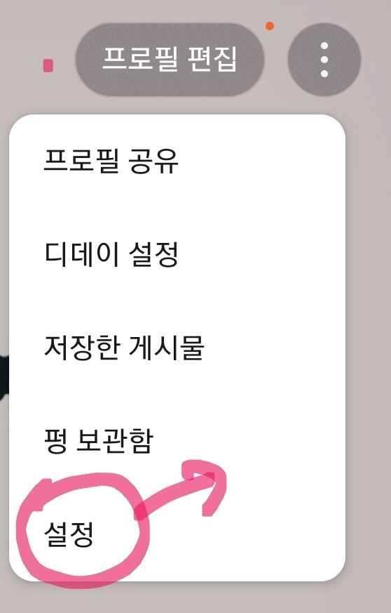 카카오톡에서 내 프로필을 열고, 오른쪽 위 ⋯ → 누르고 설정 으로 들어갑니다.