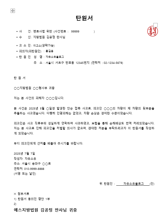 형사사건 탄원서 예시