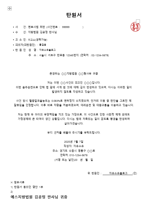 탄원서는 단순한 형식 문서가 아니라, 사건 결과에 실질적인 영향을 줄 수 있는 중요한 자료입니다.