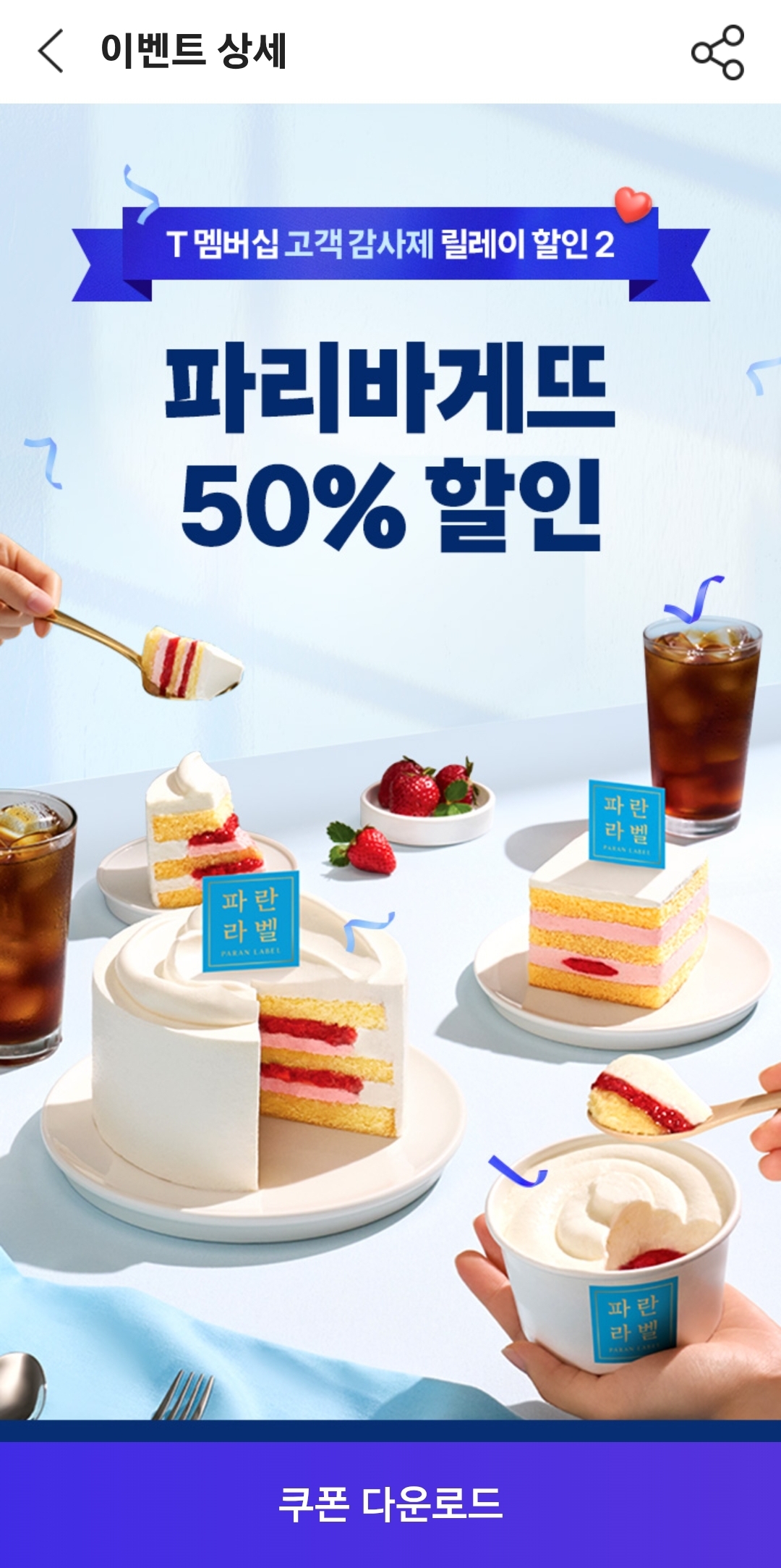 파리바게트 8월 행사 혜택을 누리려면 먼저 T멤버십 앱에서 쿠폰을 다운로드해야 합니다.