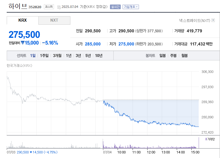 방시혁 의장의 금감원 소환 조사 소식 발표 직후, 3~5%대 하락 발생 - 종목 코드 352820 기준: