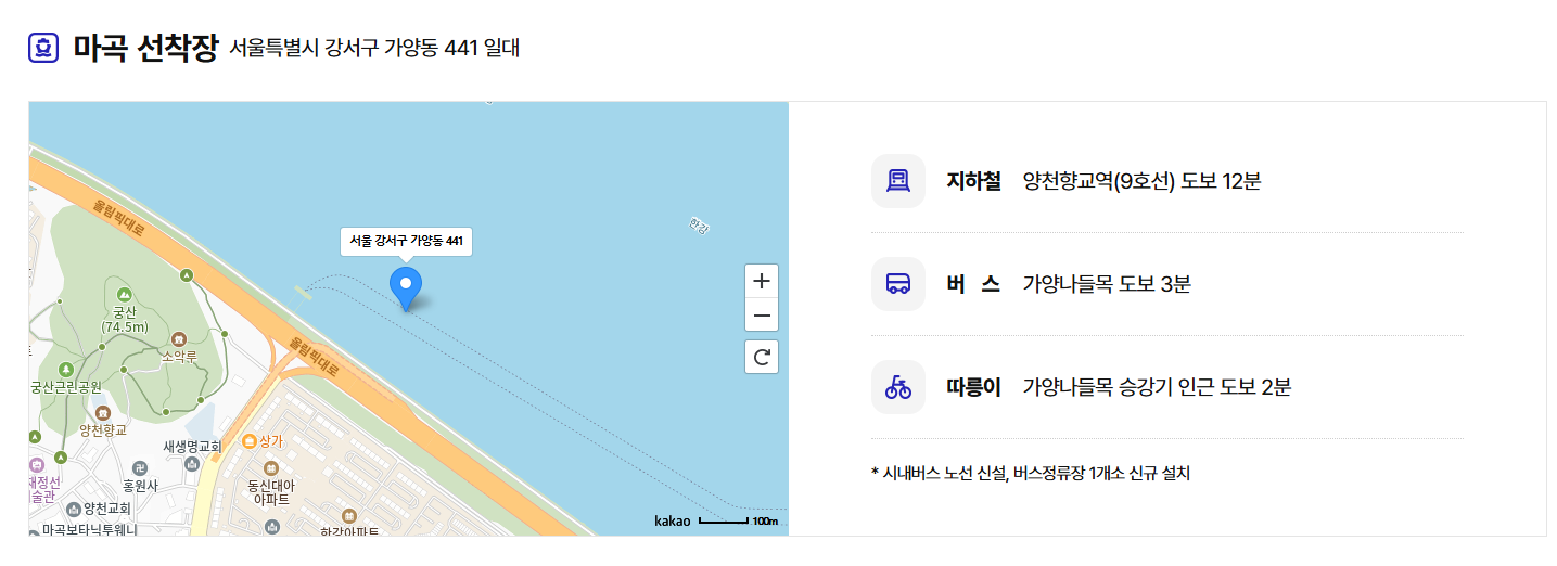 - 마곡·망원·옥수·잠실 선착장도 공원 및 대중교통과 연계