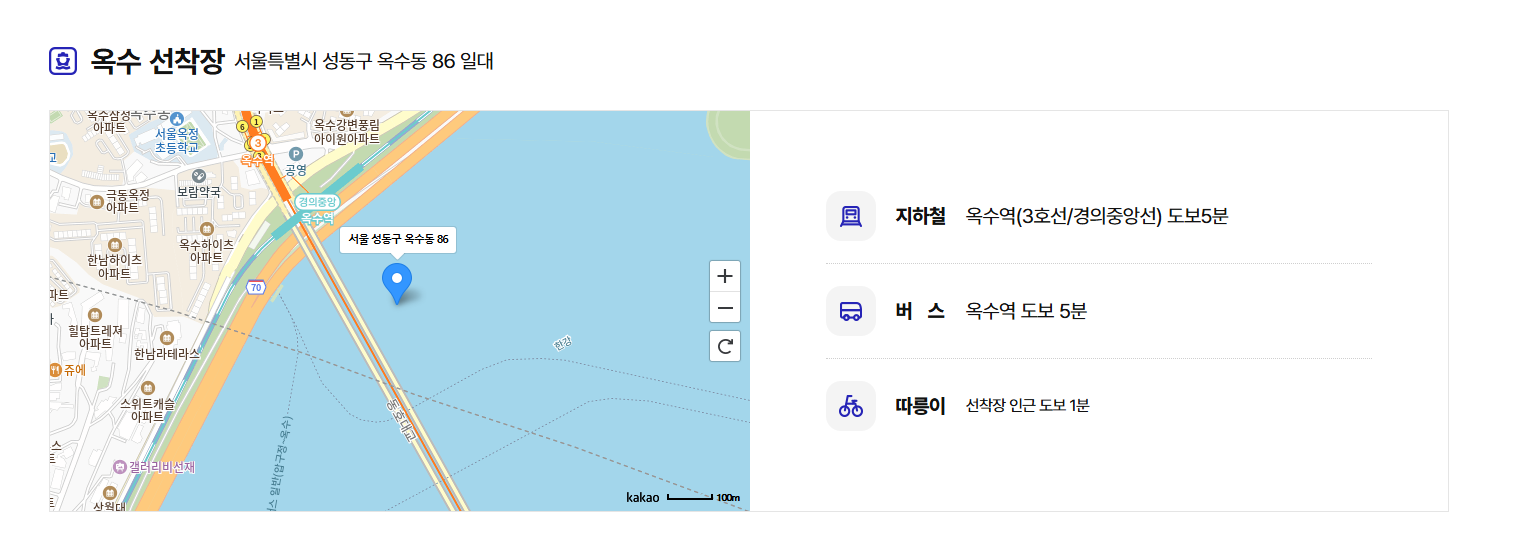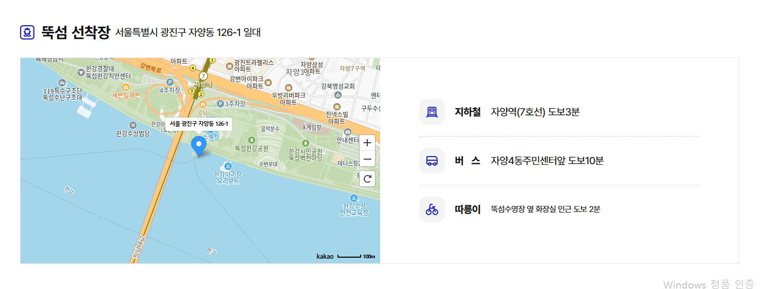 - 뚝섬 선착장: 뚝섬유원지역 도보 5분