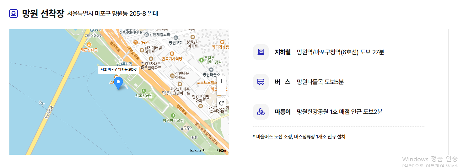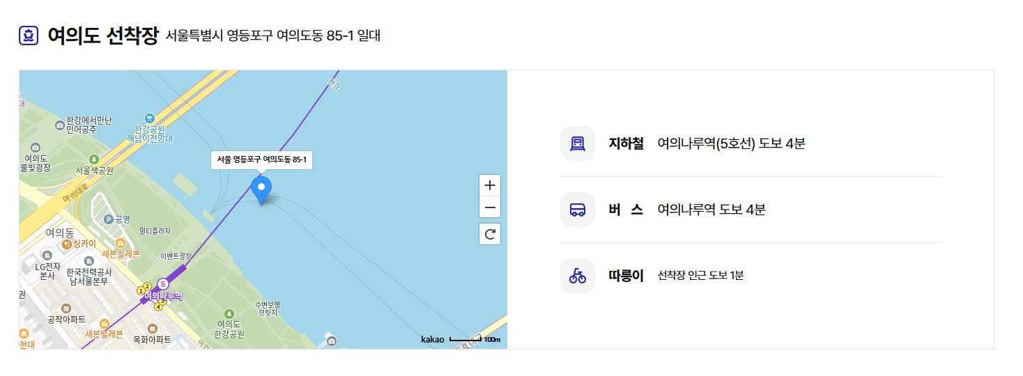 - 여의도 선착장: 여의도 한강공원 앞, 여의나루역 인근