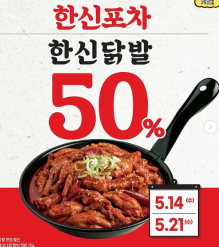- 한신포차 6월 닭발 할인 이벤트는 수·목요일마다 총 6일간 진행됩니다.