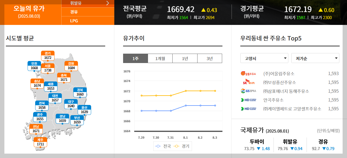 2025년 8월 기준, 전국 평균 휘발유 가격은 ℓ당 1,667.7원, 전주 대비 소폭 상승했습니다. 서울은 1,737.6원으로 전국 최고가 수준이며, 대구는 1,637.9원으로 가장 저렴한 지역 중 하나로 나타났습니다.