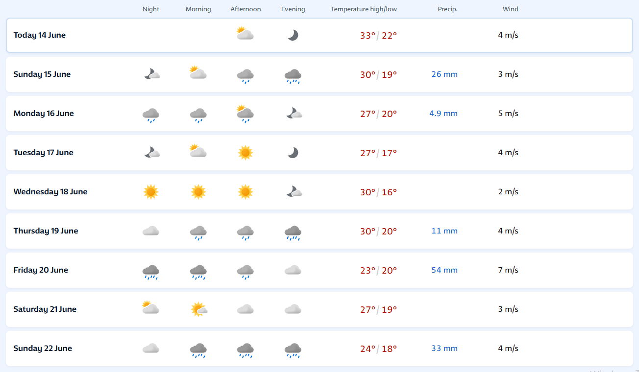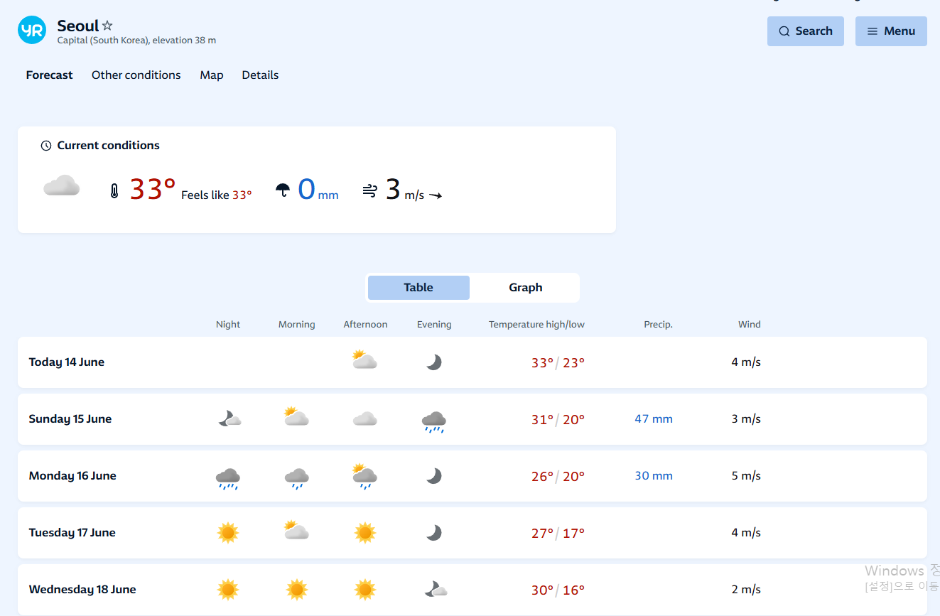 노르웨이 기상청 바로가기 클릭 👉 https://www.yr.no/en/forecast/daily-table/2-1835848/South%20Korea/Seoul/Seoul