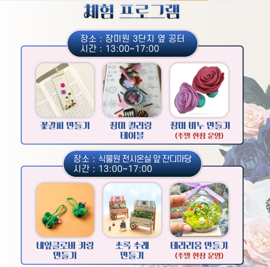 • 🧺 체험: 꽃갈피, 테라리움, 비누·목공 만들기 등