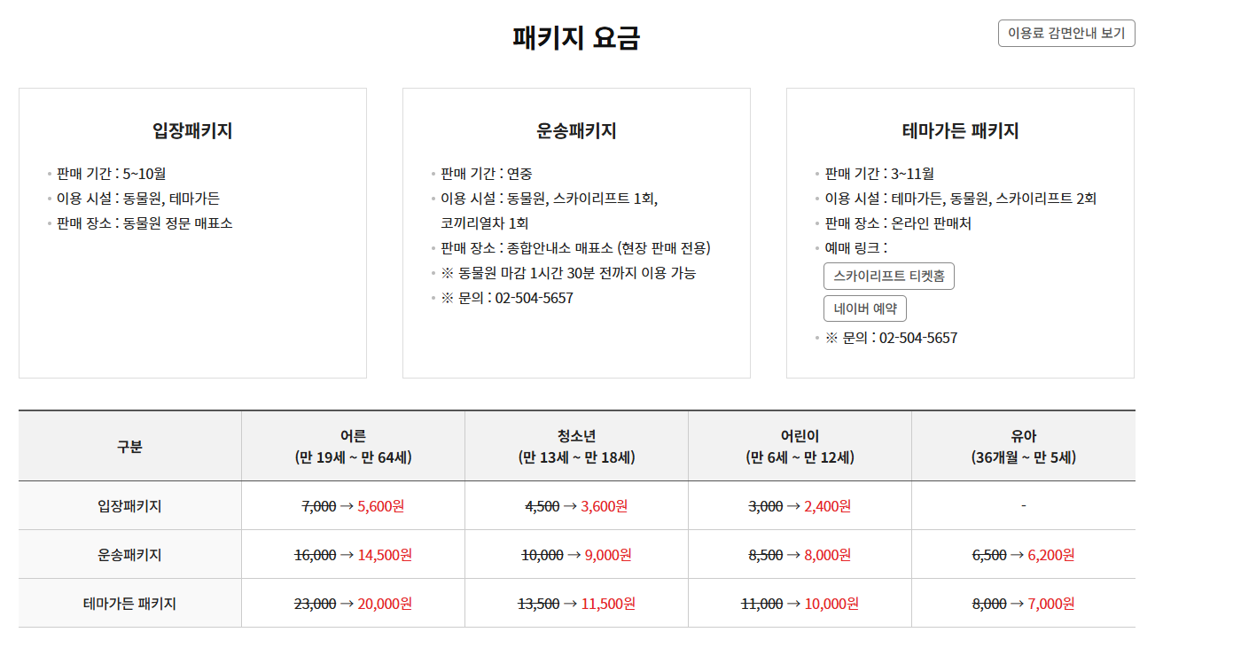 운송패키지 | 동물원 + 스카이리프트 1회 + 코끼리열차 1회 | 14,500원 | 9,000원 | 8,000원 |