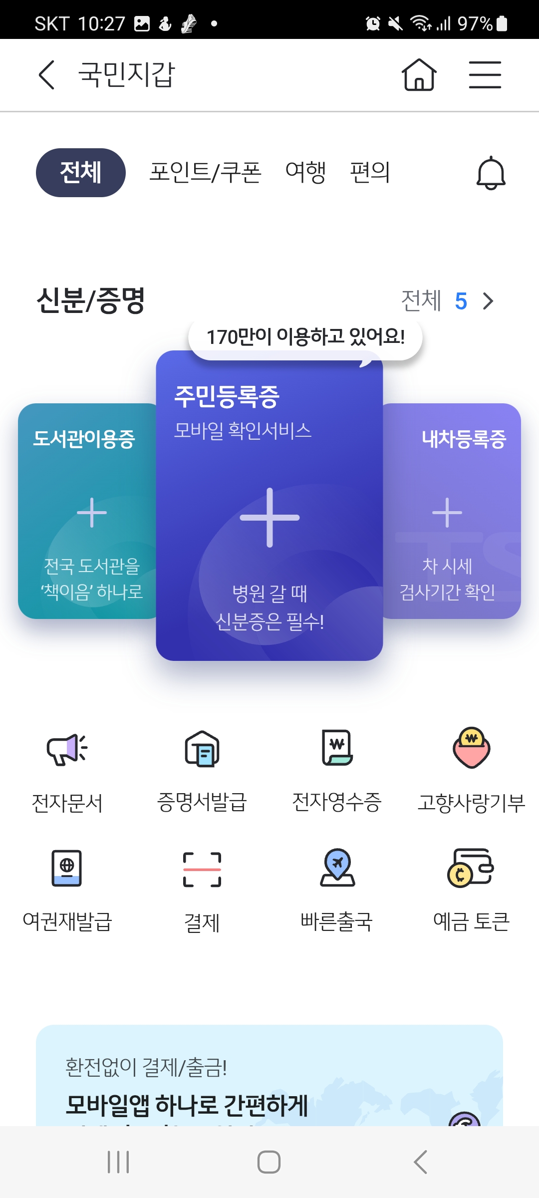 요즘 뜨고 있는 KB스타뱅킹 앱의 '국민지갑' 메뉴에서도 여권 재발급 신청이 가능합니다.