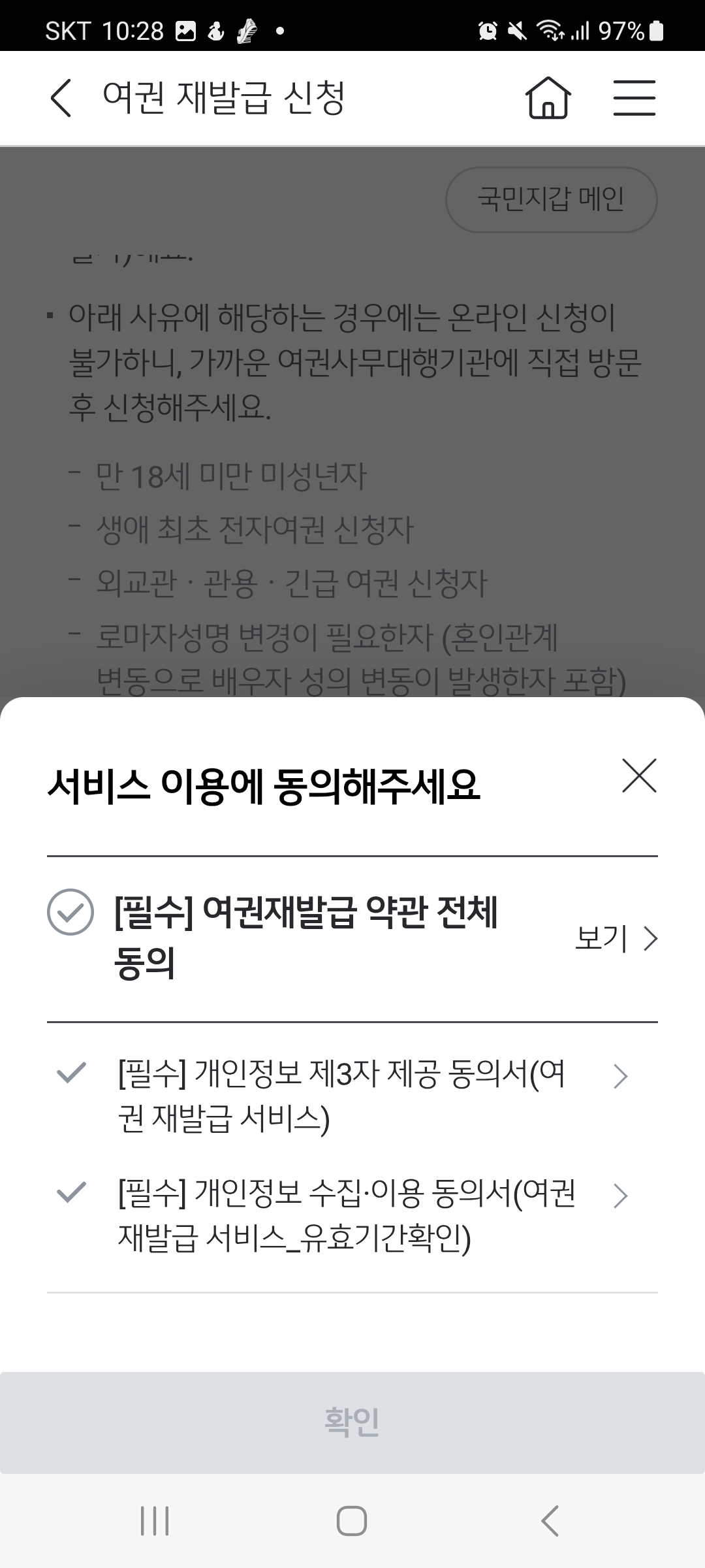 다음 조건을 충족해야만 온라인으로 여권 재발급 신청이 가능합니다.