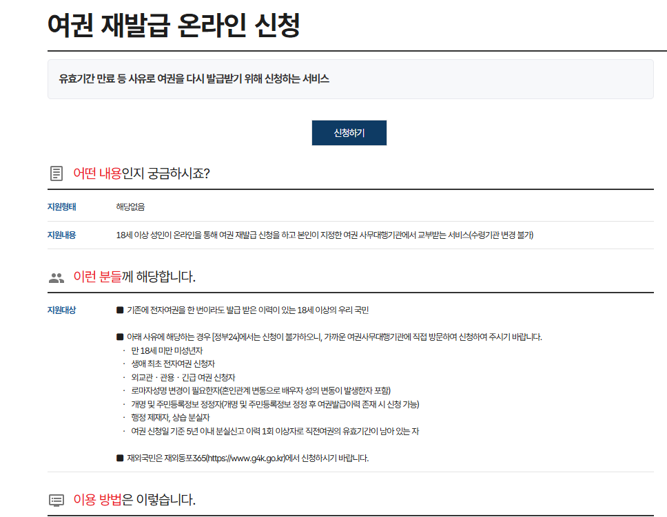 다음 조건을 충족해야만 온라인으로 여권 재발급 신청이 가능합니다.