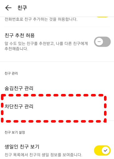 • 실수로 차단했을 경우: 설정 > 친구관리 > 차단 친구 관리 → 해제