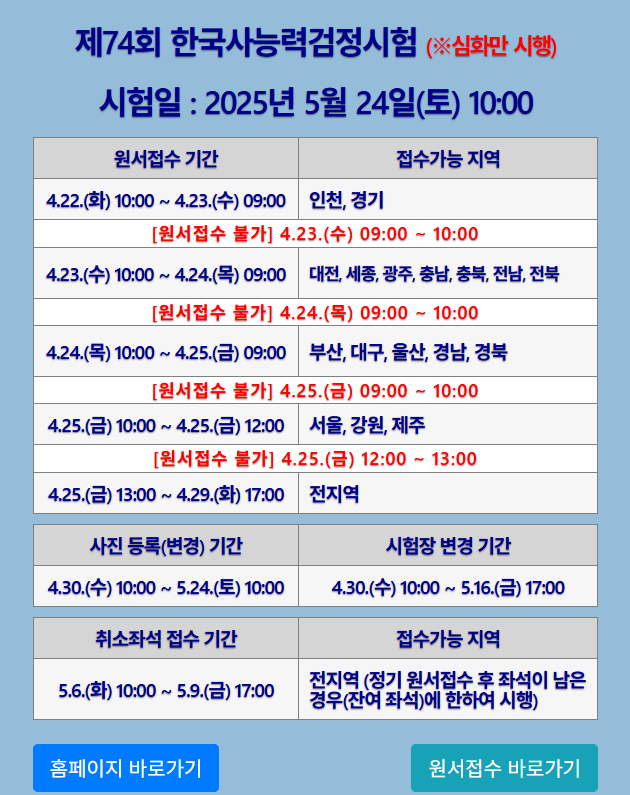 시험 일정과 관련된 자세한 사항은 한국사능력검정시험 공식 홈페이지를 참고하시기 바랍니다.