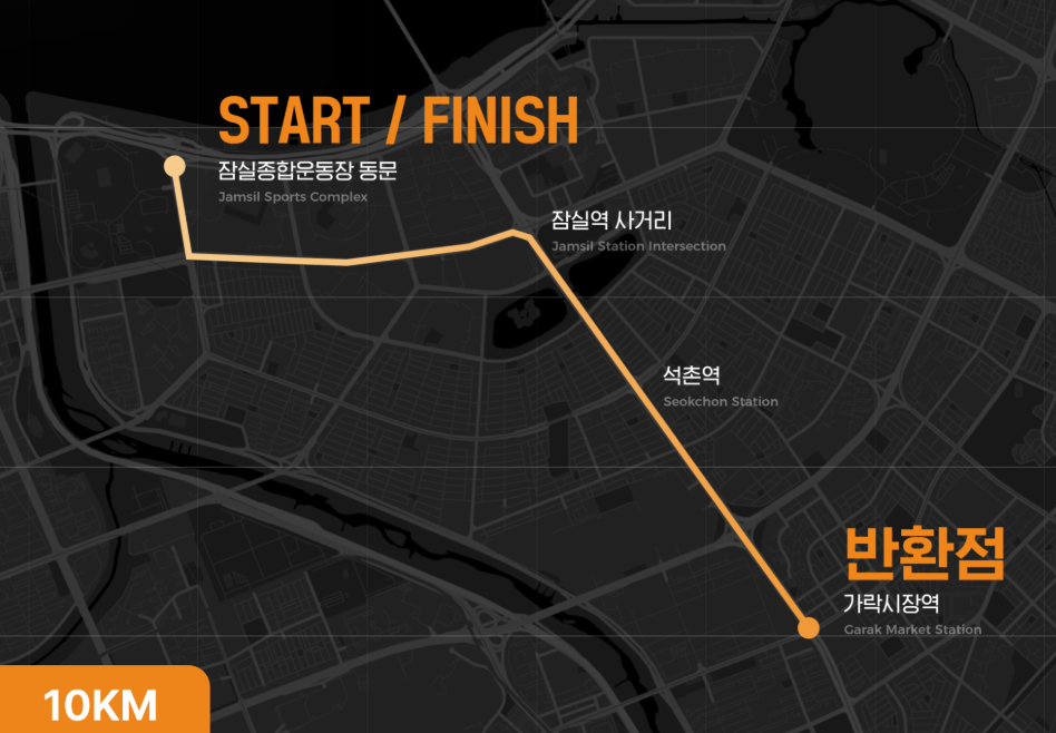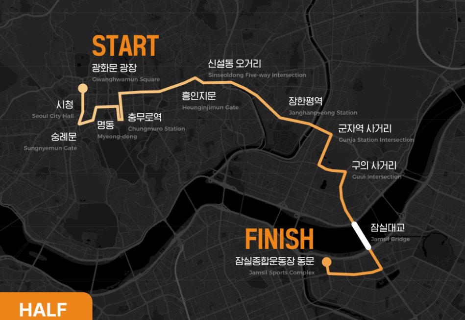 HALF 코스는 광화문광장, 10KM 코스는 잠실종합운동장에서 출발합니다.