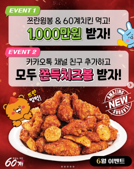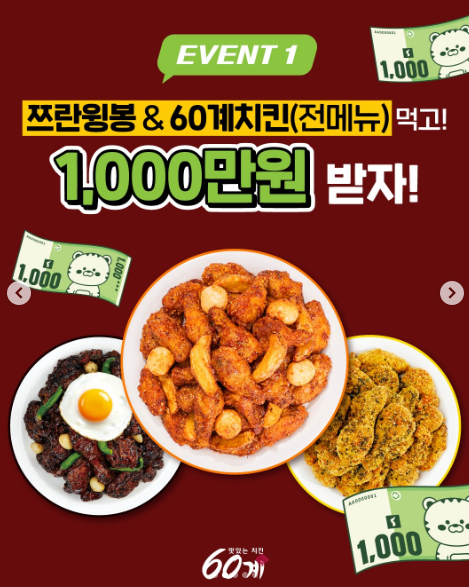EVENT 1 : 〈쯔란윙봉 & 60계치킨〉 리뷰 올리고 총 1,000만 원(50만×20명)